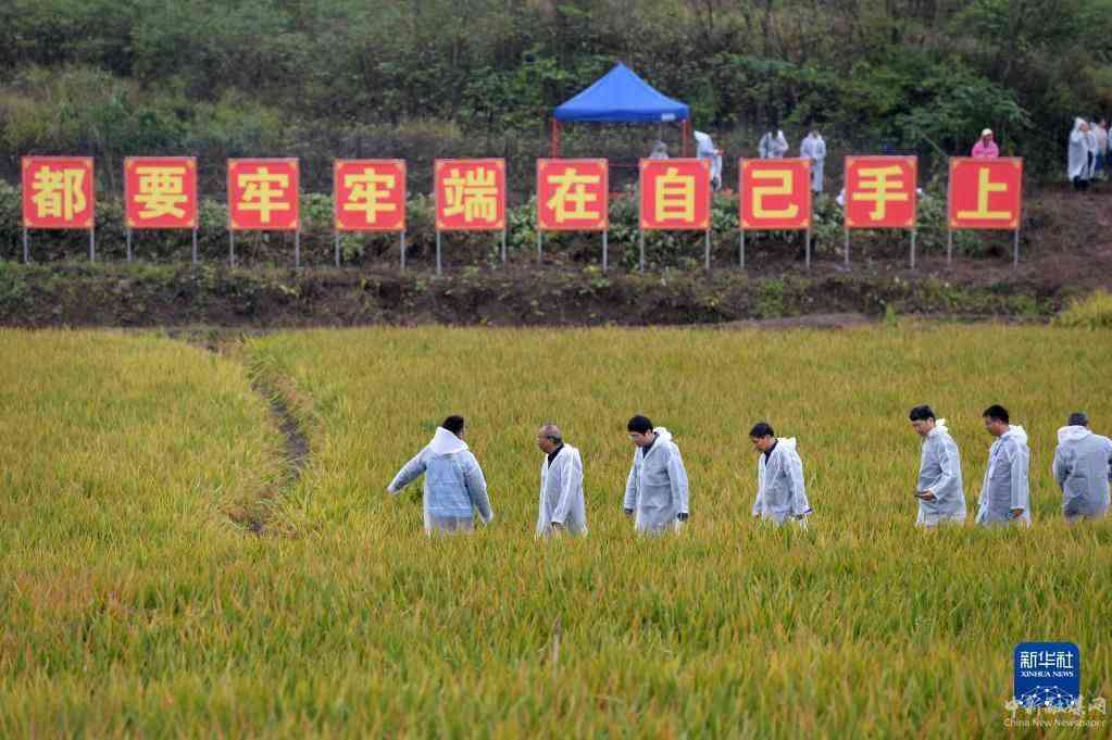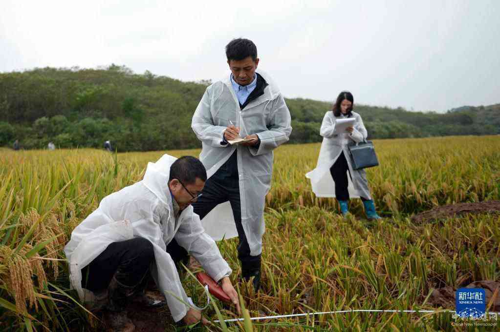 10月17日,测产组工作人员在测产现场查看水稻生长情况。新华社记者 陈振海 摄
