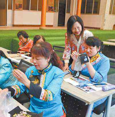 在青海省西宁市湟中区,当地残疾妇女参加由农发基金与政府合作资助的非农生计培训项目中的传统刺绣培训。