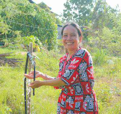 2020年10月,中国援柬减贫示范合作技术援助项目的饮水工程完工。图为当地村民向记者展示清洁的自来水。
