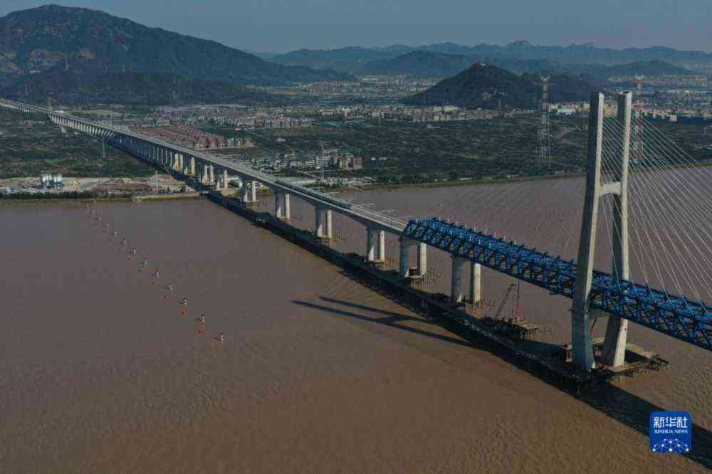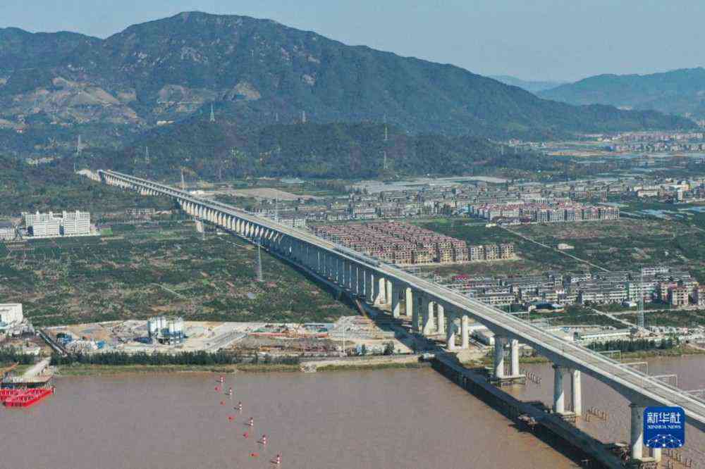 11月26日,杭台高铁首趟运行试验列车驶过台州椒江特大桥(无人机照片)。