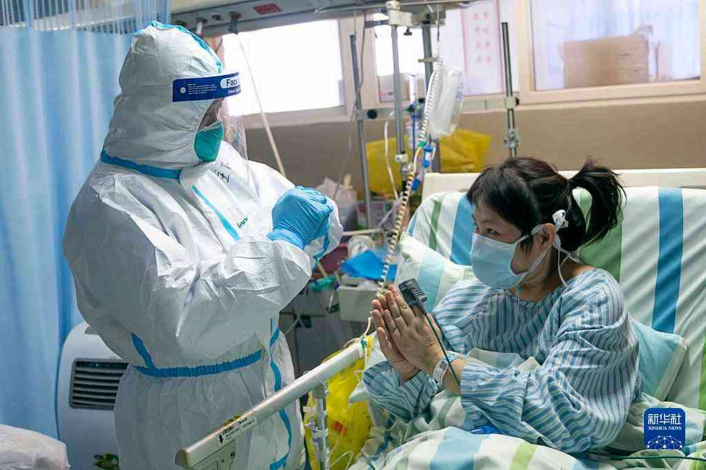 在武汉大学中南医院重症隔离病房,中南医院重症医学科主任彭志勇(左)与病情好转的患者黄淑丽互道新春快乐(2020年1月24日摄)。新华社记者 熊琦 摄