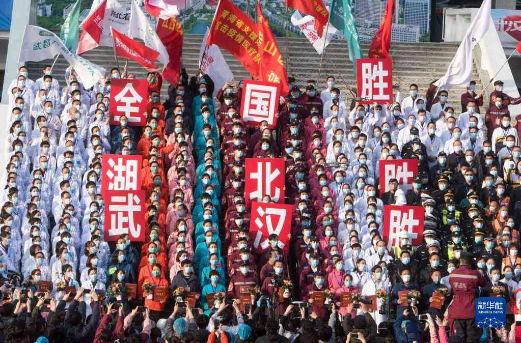 2020年3月10日,武汉所有方舱医院全部休舱。这是医护人员在武昌方舱医院前庆祝。新华社记者 肖艺九 摄