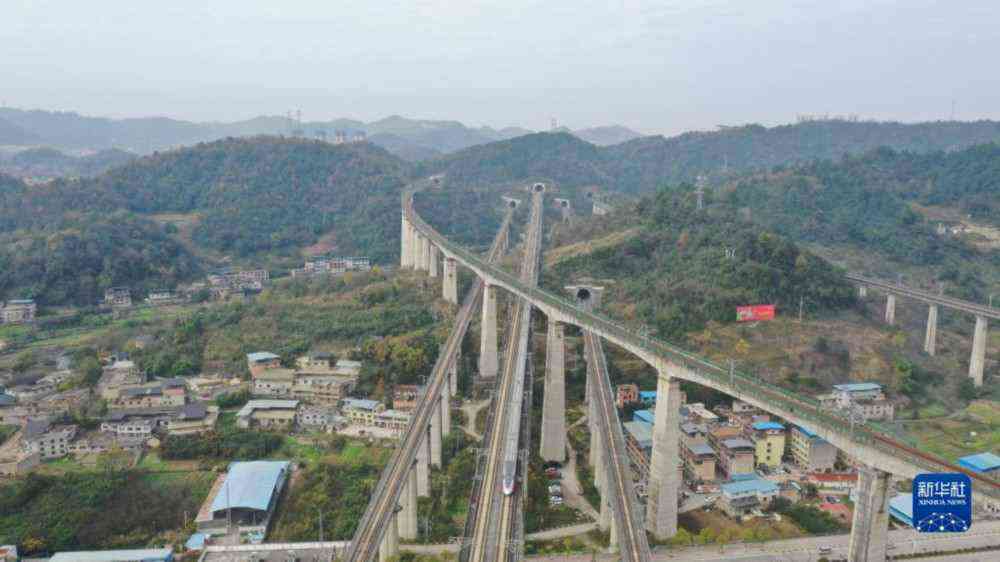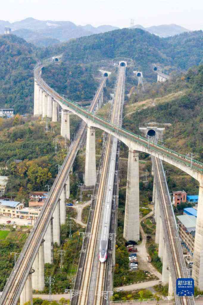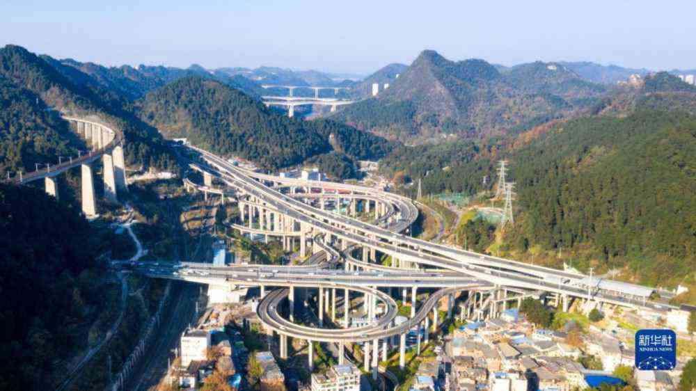 12月1日拍摄的贵阳市“五龙出海”景观。在贵阳市乌当区,高铁沪昆线、贵广客运专线、贵开城际客运专线的隧道和桥梁交织在一起,形成“五洞五桥”并行的壮观景象(无人机照片)。