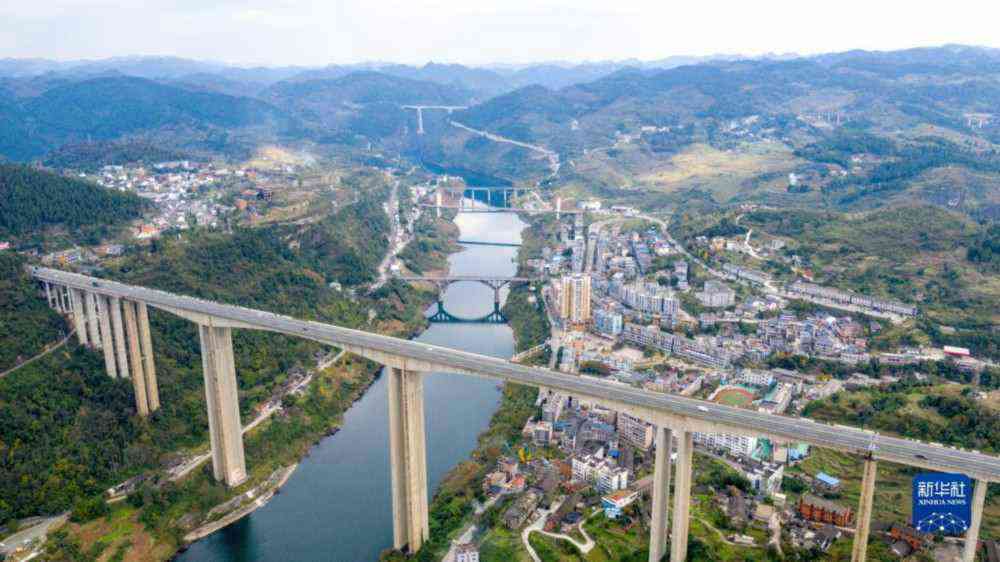 11月24日拍摄的贵州省乌江特大桥。在贵州省遵义市乌江镇不到两公里范围内,建设有横跨在乌江之上的五座桥梁。五桥飞渡的壮丽景观见证了贵州桥梁的发展史(无人机照片)。
