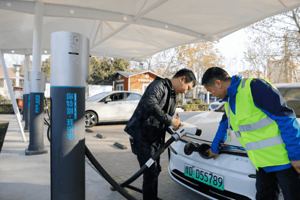2021年11月26日,在河南省宝丰县龙兴湖公园,市民使用充电桩为新能源车充电。 新华社发(何五昌 摄)
