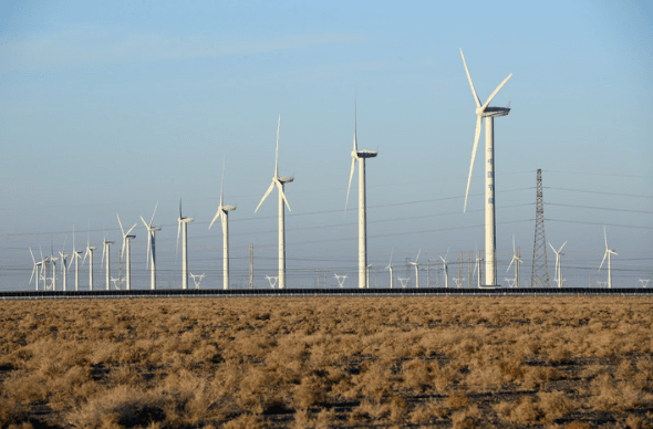 这是2021年12月8日拍摄的中节能(甘肃)风力发电有限公司玉门昌马风电场的风机。 新华社记者 范培珅 摄
