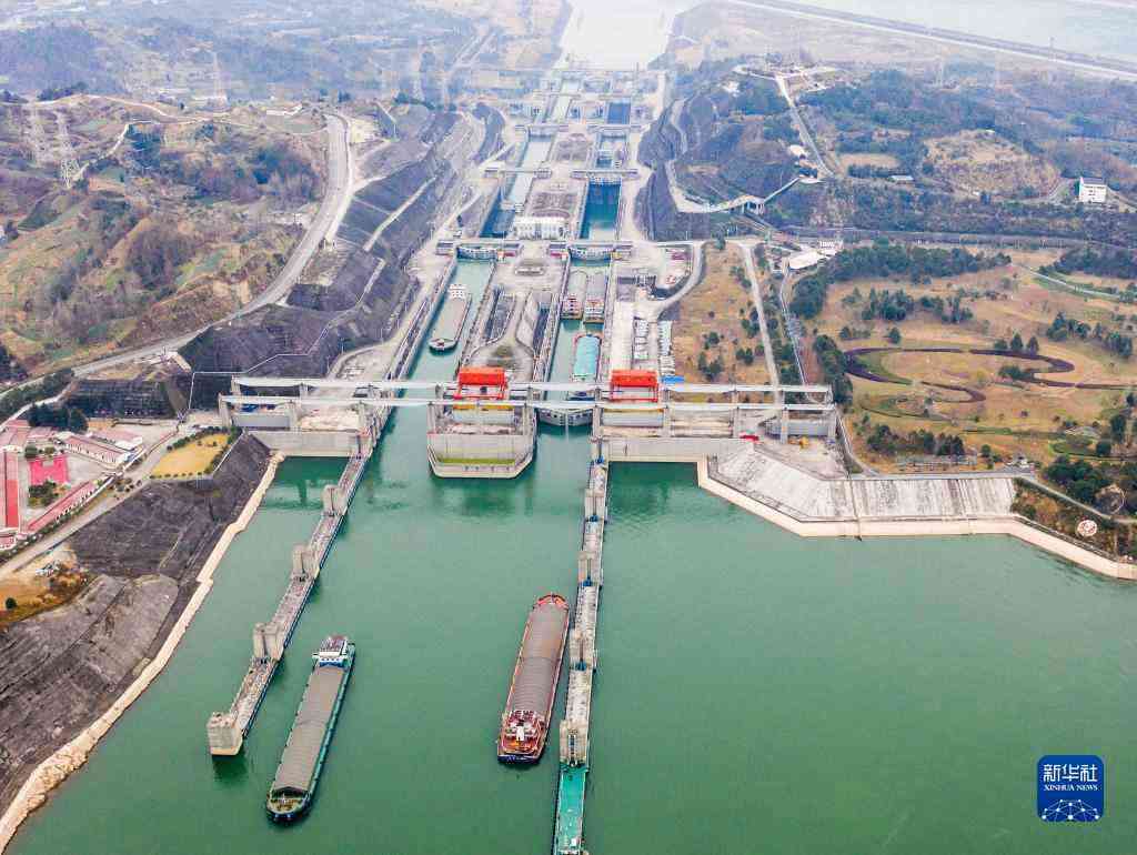 12月27日,船舶有序通过三峡五级船闸(无人机照片)。