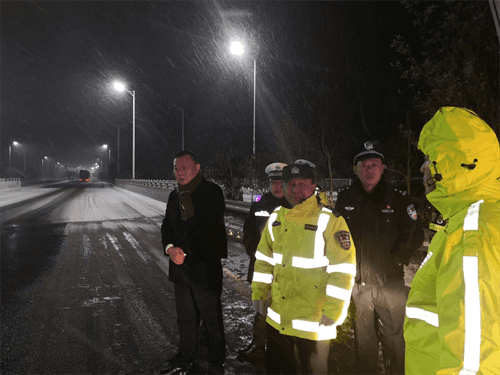 12月27日下午,公安局党委副书记、政委李忠一行来到洪市、曲兰片区,巡查恶劣天气下的道路交通安全状况,重点查看了高速连接线一、二桥的路面结冰情况,并勉励全体民、辅警继续忠诚担当,密切注意路面情况,随时协调相关职能部门撒盐化冰,并视情况动用除冰机械,确保人民群众生命财产。12月27日晚,继白天走访各乡镇查看路面管控情况后,李忠一行不辞辛苦,深夜继续走访视察了西界公路白马洲大桥、海英大道立交桥、船山西路等交警执勤点,并通过踩踏、触摸等方式对桥面结冰情况进行了实地查看。李忠高度赞扬了交警不舍昼夜、持续奋战的无畏精神,并殷切叮嘱全体民、辅警做好防寒保暖等自身安全防护工作。