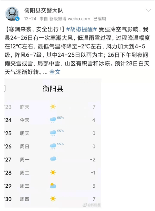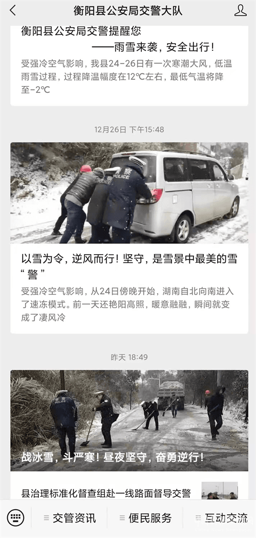 12月23日接到气象台的预警信息后,大队宣传部门便迅速行动起来。定制警示牌、联系户外电子显示屏、对接移动公司,一切有条不紊开展中,微信公众号、微博、微信群也全力发动。12月24日正值周五,晚高峰前,200余块警示牌已在各大主干道、桥梁、急弯陡坡处全部设置到位,户外电子显示屏也持续滚动着预警信息。20000万余条预警信息也通过移动平台发送到重点驾驶人手中。抗击冰雪期间,宣传部门在发布结冰、禁行路段信息供出行群众参考的同时,也通过双微平台发布抗击冰雪一线的感人事迹,此举方便了群众,鼓舞了一线战友们的士气,更向外界传递了衡阳县公安交警正能量,让群众充分感受到警察存在的安全感。