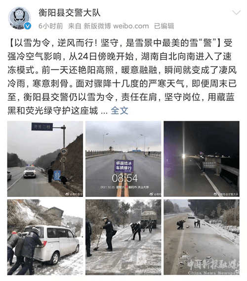 没有一个冬天不会结束,没有一个春天不会到来。12月29日,随着气温的回升,持续72小时的抗冰战役在上下一心、众志成城中落下帷幕。这场战役不见硝烟,不闻枪炮,但风霜雪雨见证了他们的无畏担当,披寒踏雪展现了他们的忠诚底色。他们是衡阳县公安交警,他们用奉献温暖着每一个归途,他们用行动践行着每一颗初心。回望这滴水成冰、披星戴月的72小时,这些动人的画面,将铭刻在每个人心底。