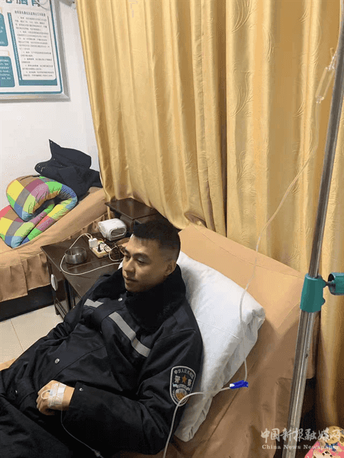 12月27日凌晨三点,从前晚7点就开始执勤的一中队辅警曾彦,感到撑不住了。事实上,从凌晨一点左右,他就已感到头痛欲裂、浑身乏力,但他一直强忍着不吭声。直到中队长黄敏发现他身体摇摇晃晃的,摸了摸他的额头,竟烫手。在大家的强行要求下,他终于前往就医。一系列检查后,医生表示:“纯粹是冻的,这么冷的天,大晚上的在外面吹风冒雪的,要注意防寒保暖啊!”躺在病床上,还没等输液,他就沉沉睡了过去,实在是太累!早上醒来,他再次要求上一线,直到中队长命令他好好休息,他才没有坚持。但他仍坚守在中队,随时准备支援一线。