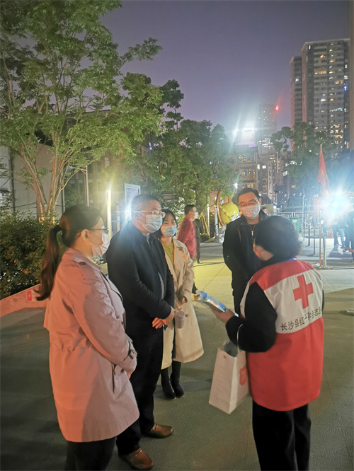 4月18日,街道工委书记陈红升率街道主要负责人亲临一线检查核酸检测工作,他们将街道十几个检测点逐一检查,指导并慰问现场工作人员,解决现场困难问题,直至深夜11点才结束。晚上八点,水风井社区阳光城核酸检测点,水风井社区原党委书记鲁刚和现任党委书记张玉还在讨论商量工作安排。望麓园街道工委书记陈红升书记带领街道的两位年轻主任亲临现场检查核酸检测工作,通过交谈得知陈书记他们今晚还要跑很多点,确保核酸检测工作的顺利进行。
