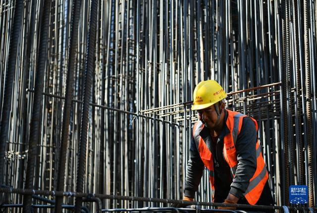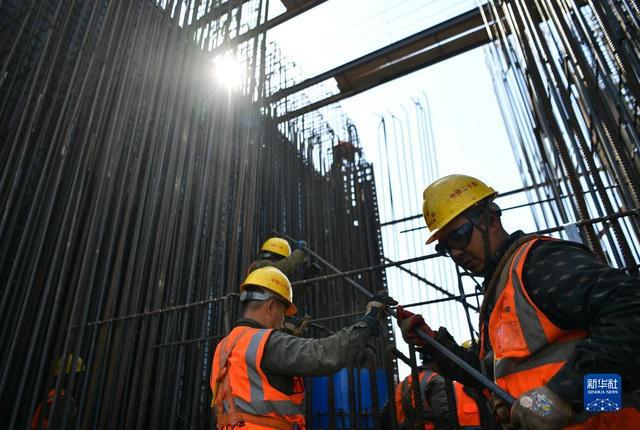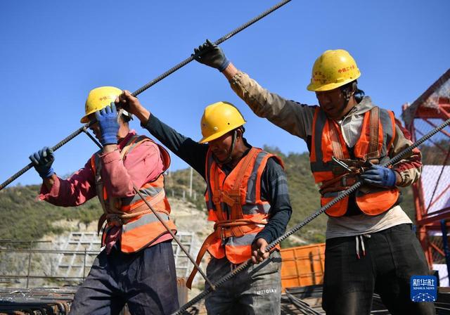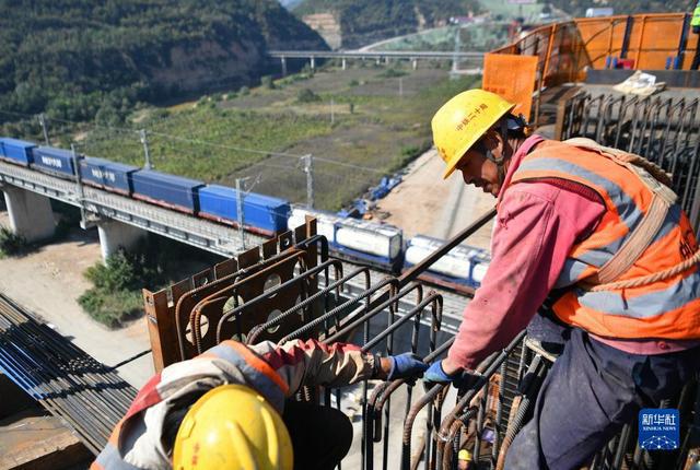 9月28日,中铁二十局施工人员在位于延安市洛川县的西延高铁北洛河特大桥作业。 新华社记者张博文摄