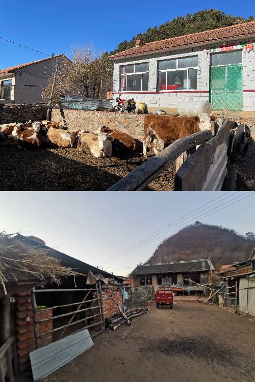 11月初,记者在两村实地走访,发现村里的牛羊圈一般建在村民们的房前屋后,多以木头围建成方形,有的是露天圈,有的顶上铺着木板、铁板、塑料布等。“彩钢板都不行,容易被卫星拍下来,我家这有树挡着还好点。”古晓峰家的牛圈就盖在家门口。