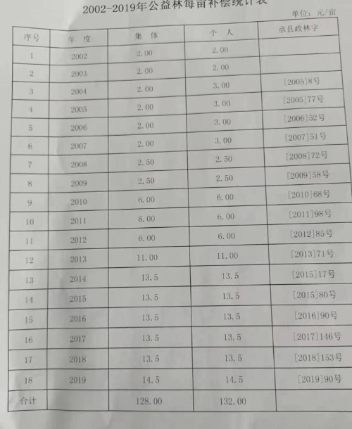 记者从松树底村获得的相关数据显示,2009年,公益林补贴为2.5元/亩,此后逐渐增长到2020年的14.5元/亩。2015年至2018年,天然保护林补贴为10元/亩/年,2019年及以后为11元。以该村为例,91户村民可享受天然保护林补贴,公益林补贴则有90%以上的村民可享受。