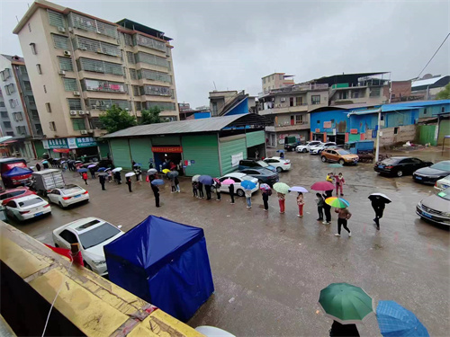 “你看那些志愿者,一个个淋着雨在维持秩序,真辛苦。”“就是,所以我们大家要听从安排,老老实实呆在家里,不能添乱,核酸检测现场,志愿者们跑前跑后,既要维持秩序,还要帮一些老人登记信息,即便衣服都湿透了,还一直坚守在岗位上……”珠泉亭社区居民李柏福说。