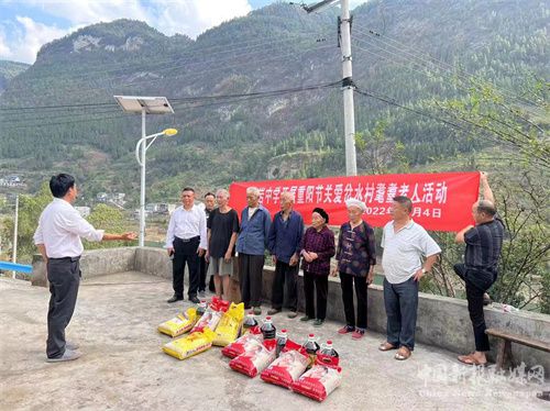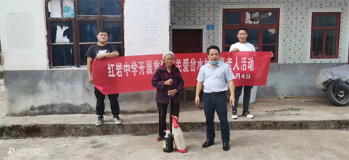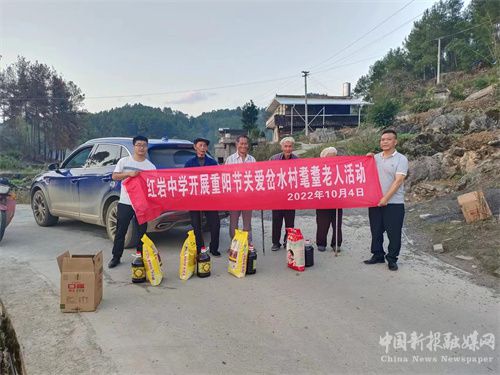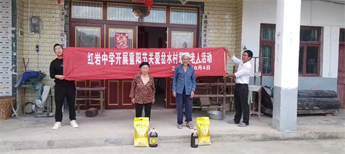 新霜点染枫叶红,清风吹起菊花香,在这晚秋时节,当人们还沉浸在欢度祖国73岁华诞的喜悦中时,又迎来了一个传统节日——重阳节。10月4日,风和日丽,为弘扬中华民族的传统美德,教育全校师生孝亲敬长,增强爱老助老意识,桐梓县红岩中学组织部分在校值班的教师,在花秋镇岔水村村干部的带领下,慰问岔水村全村耄耋之年的76名老人,为他们分别送上一袋米,一桶油等生活物资予以慰问,并祝福老人们节日快乐,身体健康!
