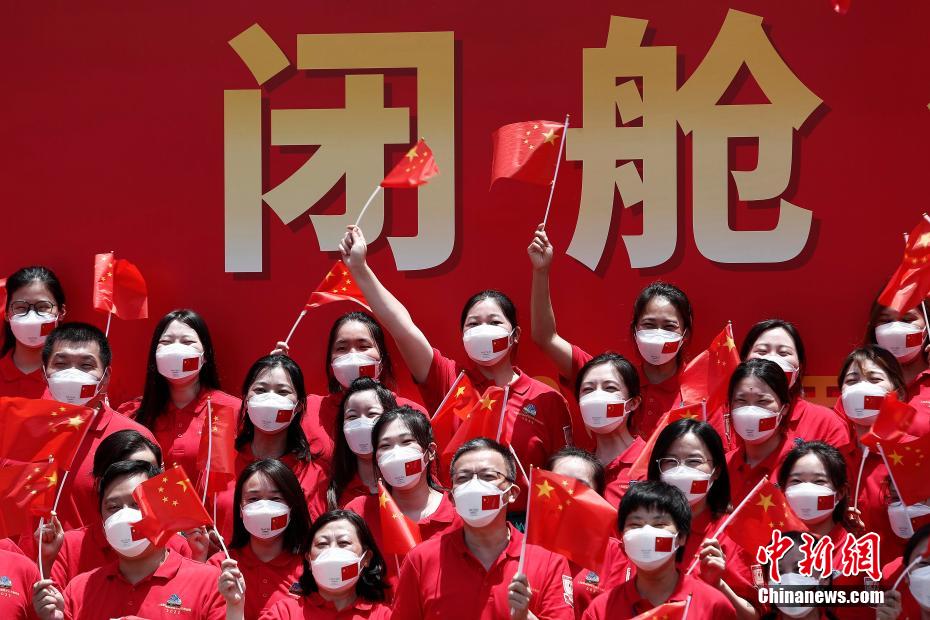 6月15日,上海新国际博览中心方舱医院正式闭舱。截至14日12时,收治患者47920名。包括援沪医疗队在内,共20支医疗队近7千余名医护参与救治工作。至此,上海市市级方舱医院除花博会复兴馆外,将全部实现休舱或闭舱。下一阶段,花博会复兴馆方舱医院将继续保持常态化运行,部分休舱的方舱医院将作为后备市级方舱医院。图为上海市第一人民医院医疗队医护人员合影留念。 殷立勤 摄