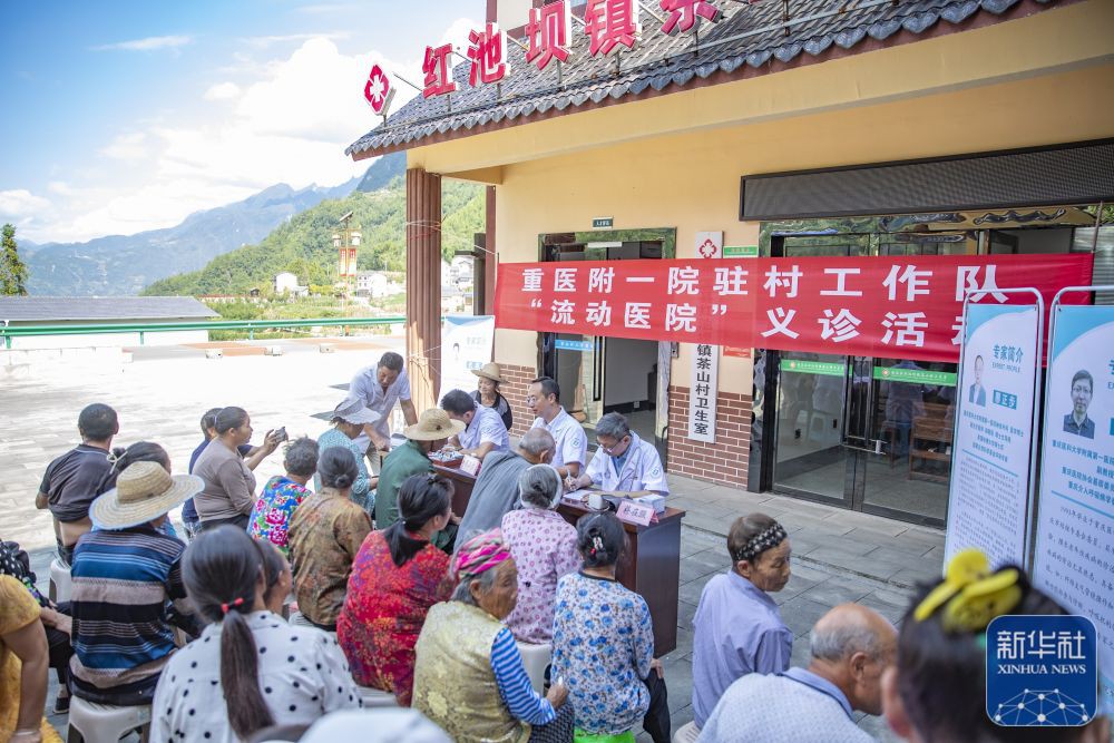 8月12日,在重庆市巫溪县红池坝镇茶山村,廖正步和同事为村民义诊。新华社记者 黄伟 摄