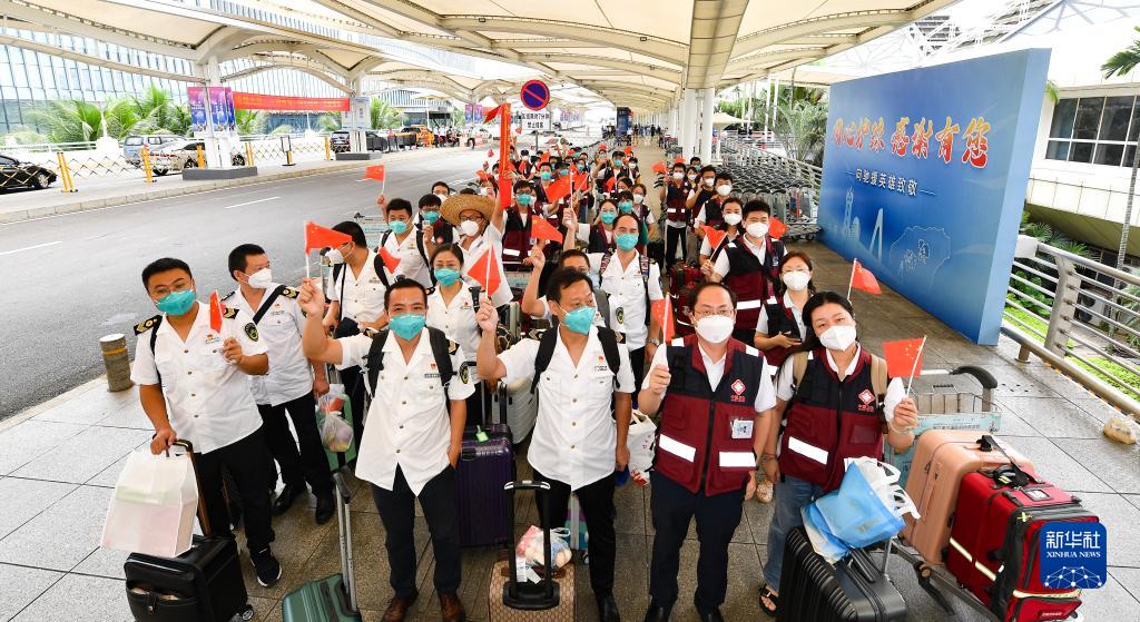 8月30日,四川援琼医疗队队员在海口美兰机场候机厅外合影留念。当日,来自上海、安徽、四川的援琼医疗队队员陆续从海南返程。新华社记者 杨冠宇 摄