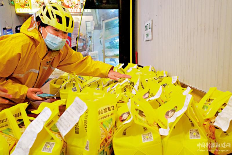 图:11月22日,广州市天河区暂停堂食,外卖员在一店舖取餐。\中新社