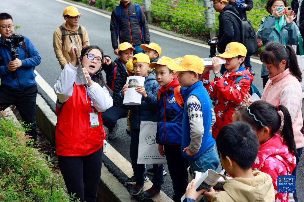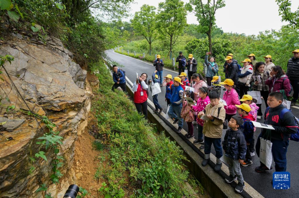 4月17日,参加活动的地学旅游爱好者、中小学生和部分媒体工作者,在地质专业工作人员的带领下进行铜锣山科学考察。