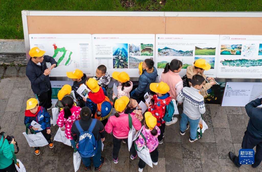 4月17日,参加活动的中小学生在地质专业工作人员的带领下,对铜锣山矿山公园的地质遗迹和生态修复进行科学考察(无人机照片)。