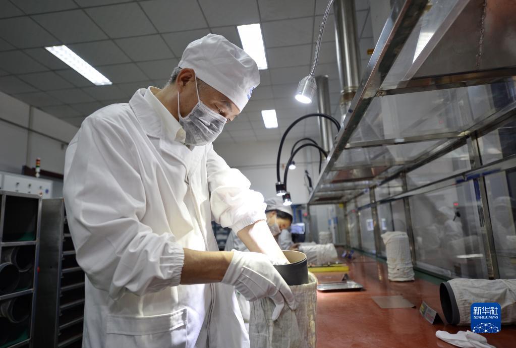 7月14日,杨尹渝在为某型号固体发动机内壁粘贴隔热胶皮。