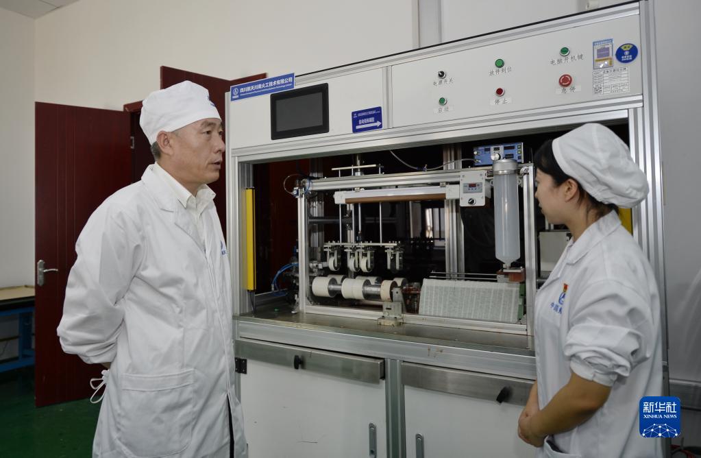 7月14日,杨尹渝(左)在车间了解生产进度。