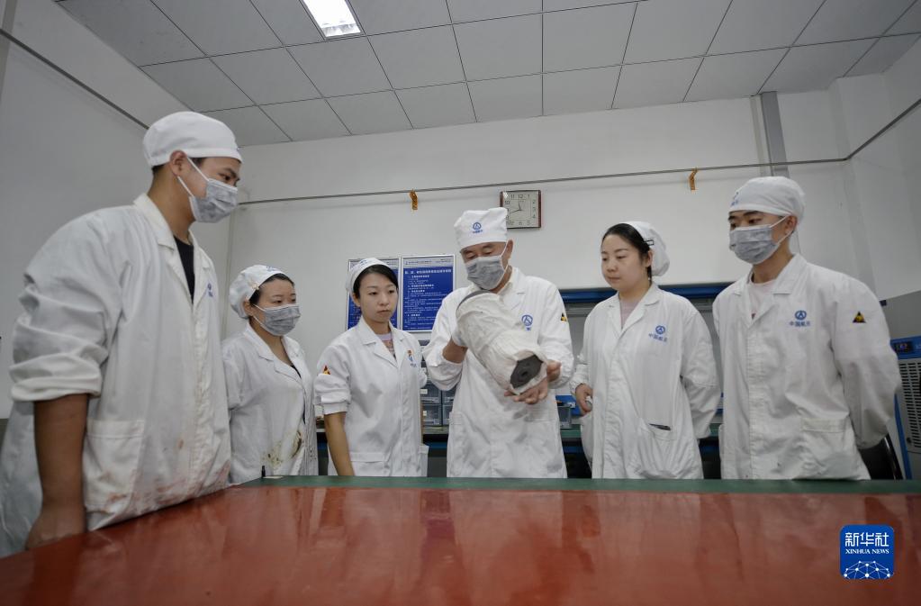 7月14日,杨尹渝(右三)在指导团队成员为某型号固体发动机内壁粘贴隔热胶皮技巧。