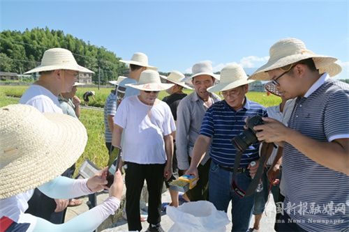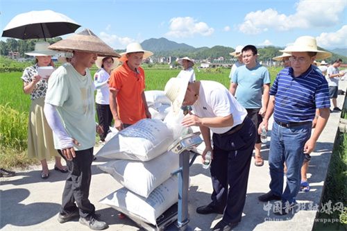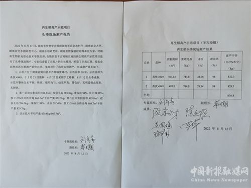 专家组一行现场测产机割两丘田,第一丘田实割面积504.63平方米,收获毛谷783.8公斤,净谷比98%,水分28.98%,按13.5%水分折合每亩干谷产量832.3公斤。第二丘田实割面积493.0平方米,收获毛谷766.0公斤,净谷比98%,水分29.34%,按13.5%水分折合每亩干谷产量829.3公斤,该示范片平均产量每亩830.8公斤。湖南省农业农村厅研究员、再生稻头季现场测产专家组组长刘年喜,在热烈的掌声中宣布了测产结果。(贺上升)