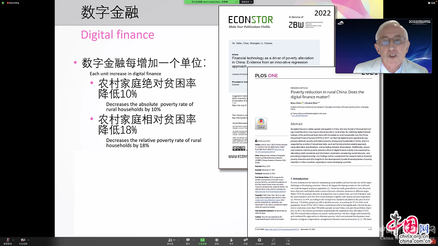 图为英国社会科学院院士、牛津大学格林坦普学院荣休教授、北京师范大学外籍教授罗伯特·沃克在2022科技赋能乡村发展国际论坛开幕式作主旨发言