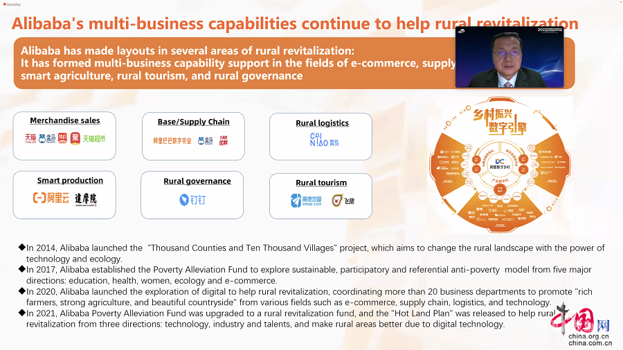 阿里研究院副院长谭崇钧在主旨发言中指出:“阿里巴巴在数字化助力乡村振兴方面有着全面的布局,在电商、供应链、物流、智慧农业、乡村旅游、乡村治理等领域都有业务能力的支撑。我们扎根县域,聚焦产业振兴,发挥科技赋能创新和平台连接市场的优势,探索形成了品牌化提升乡村产品价值、互联网化助力农文旅融合、数智化畅通产供销全链路、实训化促进乡村就业创业四大典型路径。希望我们的实践能够带来启发,帮助更多的国家找到适合自己的数字化发展路径。”