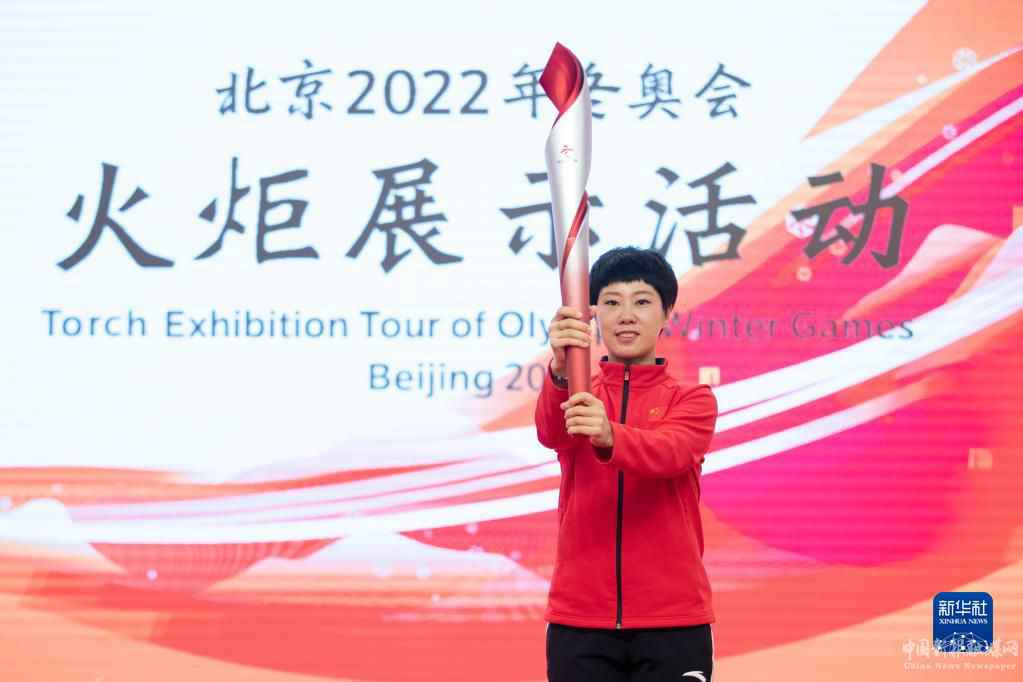 1月5日,冬奥会短道速滑冠军张会在活动现场手持火炬进行展示。