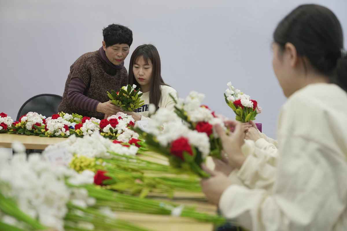 1月5日,志愿者组装北京冬奥会颁奖花束。(中国日报记者 高尔强 摄)