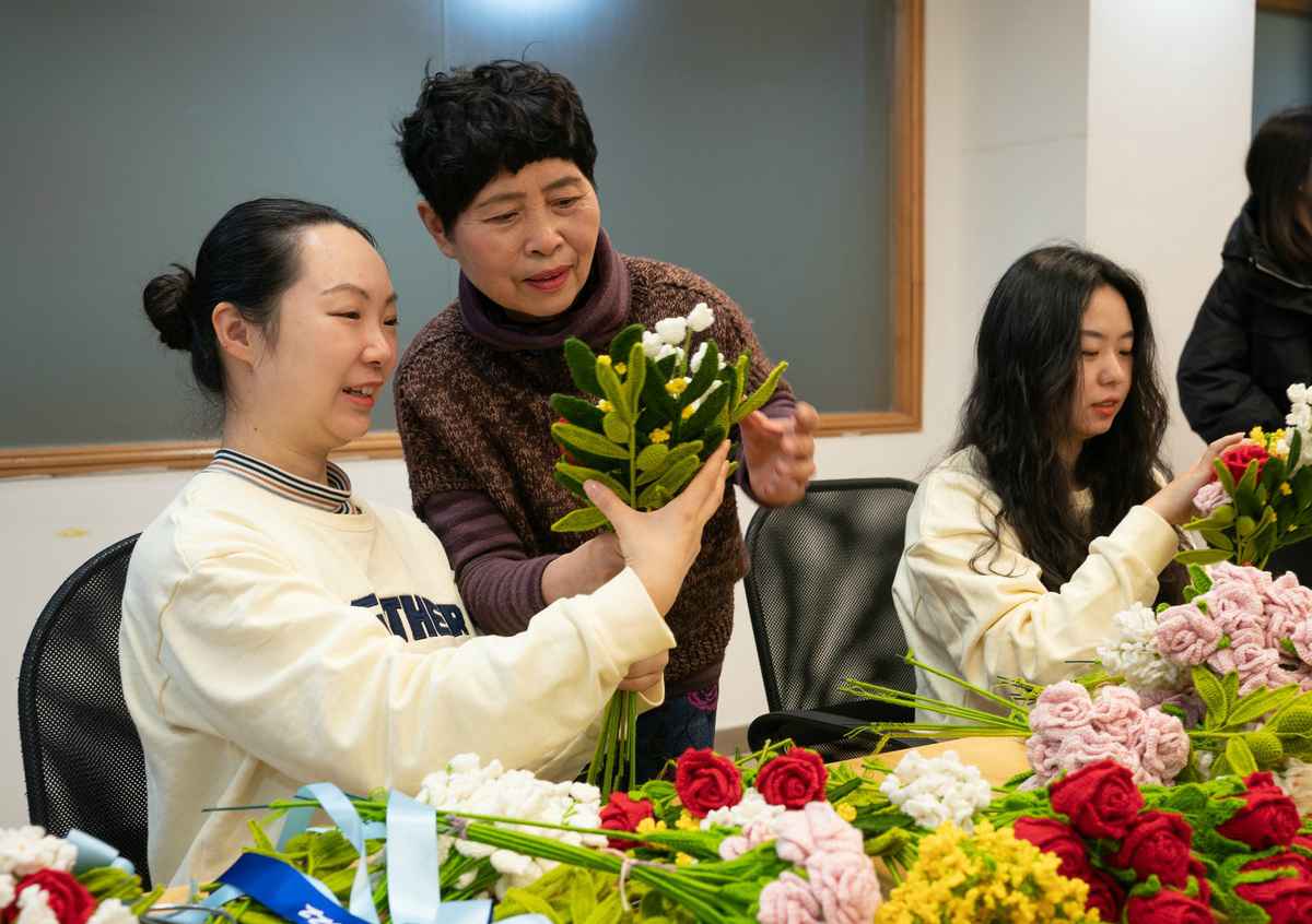 1月5日,“海派绒线编织技艺”上海市级代表性传承人励美丽(左一)指导志愿者组装北京冬奥会颁奖花束。(中国日报记者 高尔强 摄)