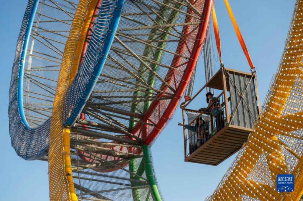 1月11日,工人们加装塔身的飘带形装饰材料。