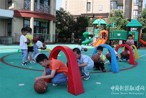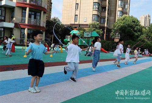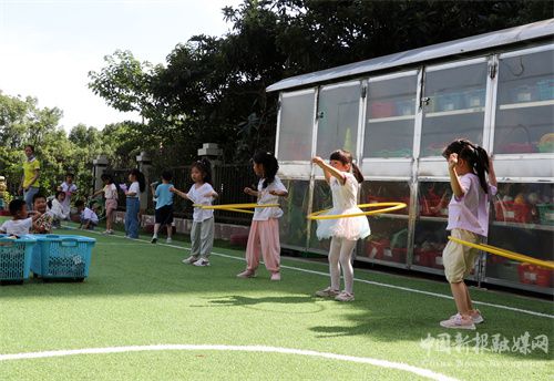 2022年6月10日,安徽省合肥市庐江县庐城镇达观天下幼儿园,小朋友们在争先恐后地练习呼啦圈、跳绳、投篮、平衡等项体育运动。