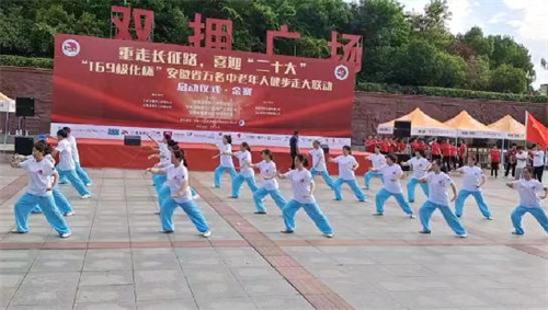 6月28日,由安徽省老年人体育协会、安徽省健康文化旅游产业促进会、安徽省健康业社会团体联盟主办的“安徽省万名中老年人健步走活动启动仪式”在革命老区---金寨县红军广场隆重举行。金寨县大别山武术协会的会员们为启动仪式举行了精彩的武术表演,赢得了观众的热烈掌声。