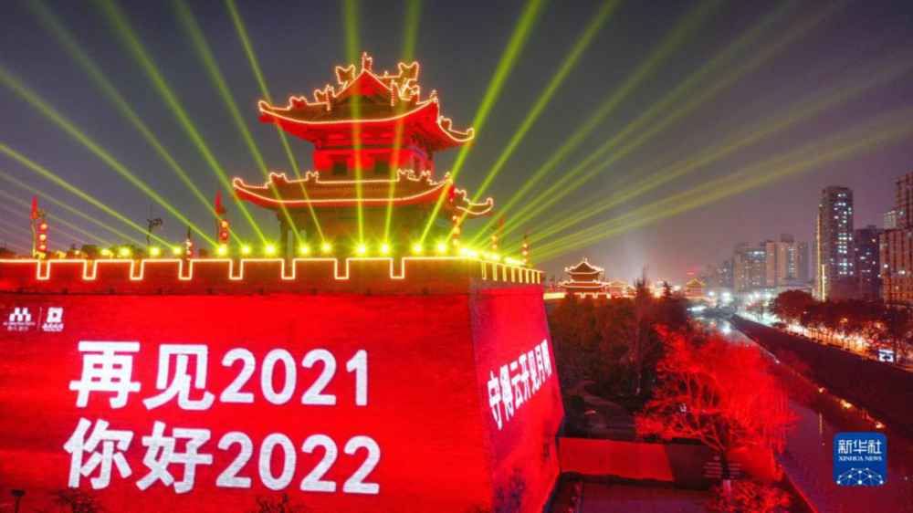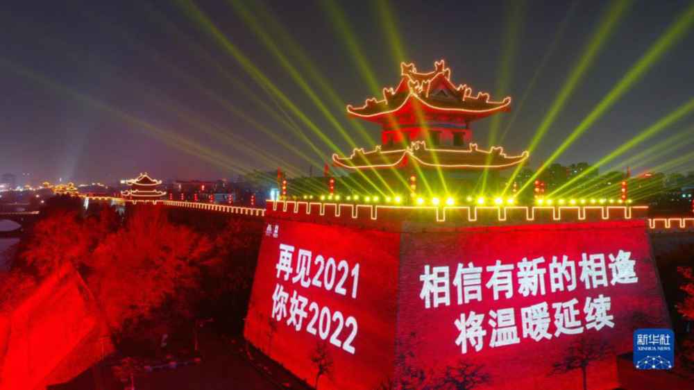 当晚,西安城墙景区在城墙东南角打出“再见2021 你好2022”“万众一心抗疫情”等光影字样,迎接新年到来的同时,向各行各业奋战在战疫一线的人们致敬。