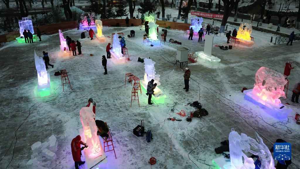 1月7日,冰雕师在哈尔滨冰灯艺术游园会园区参与全国专业冰雕比赛(无人机照片)。
