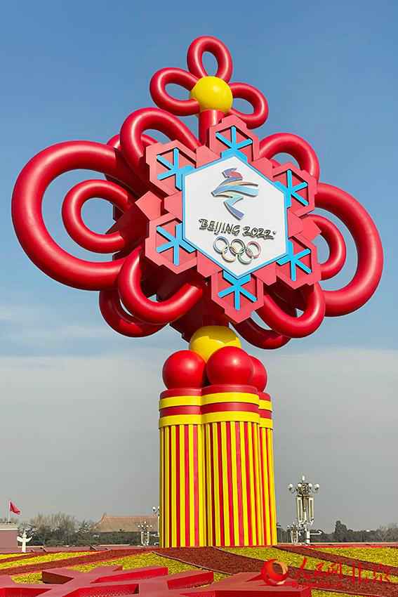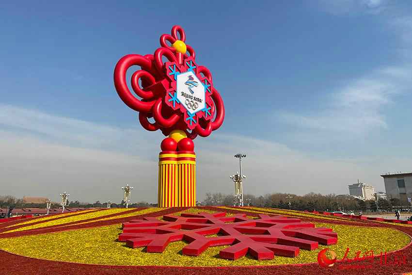 “精彩冬奥”主题花坛亮相天安门广场。人民网尹星云摄