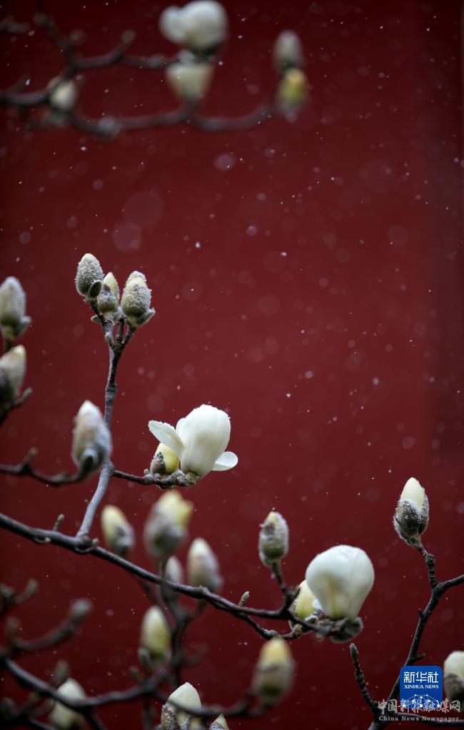 3月17日,北京市门头沟区妙峰山民族学校内的玉兰花在雪中绽放。新华社发(侯继庆摄)