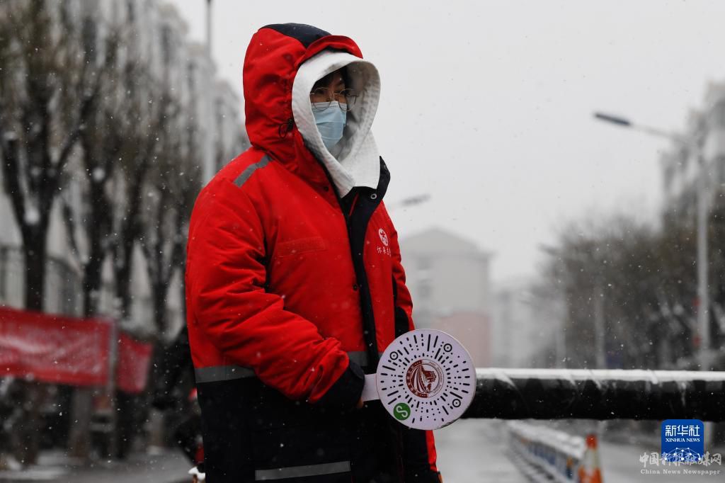 3月17日,在河北省怀来县沙城镇,一名防疫志愿者在雪中值守。新华社发(孙慧军摄)