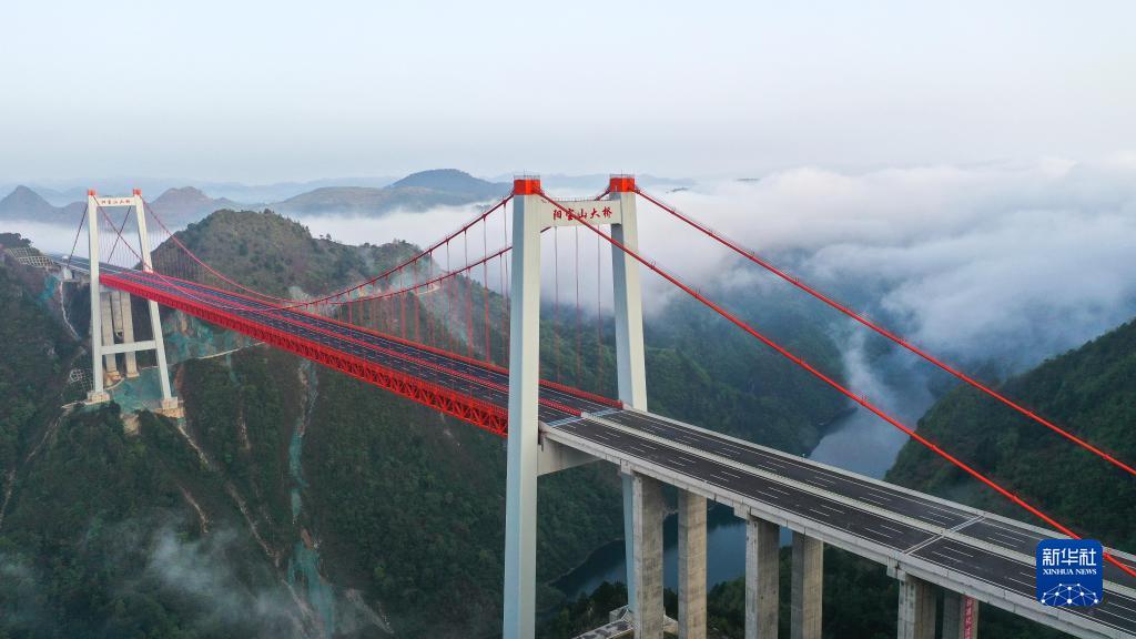 3月28日拍摄的晨雾中的贵黄高速公路阳宝山特大桥(无人机照片)。
