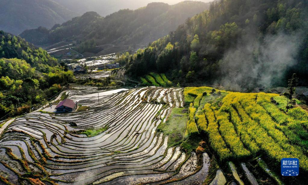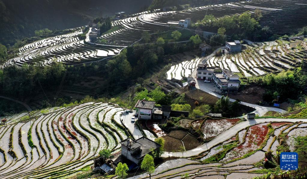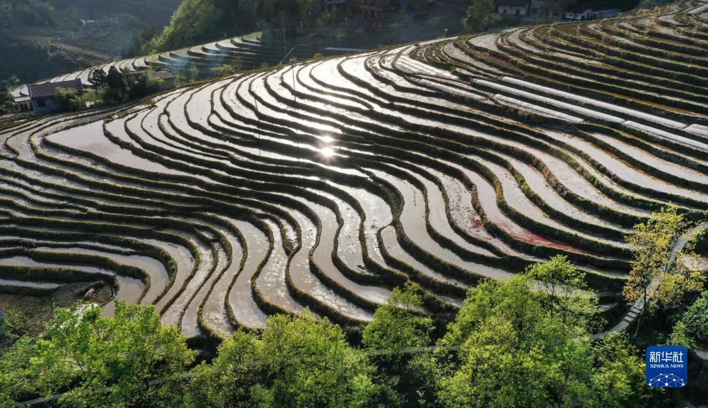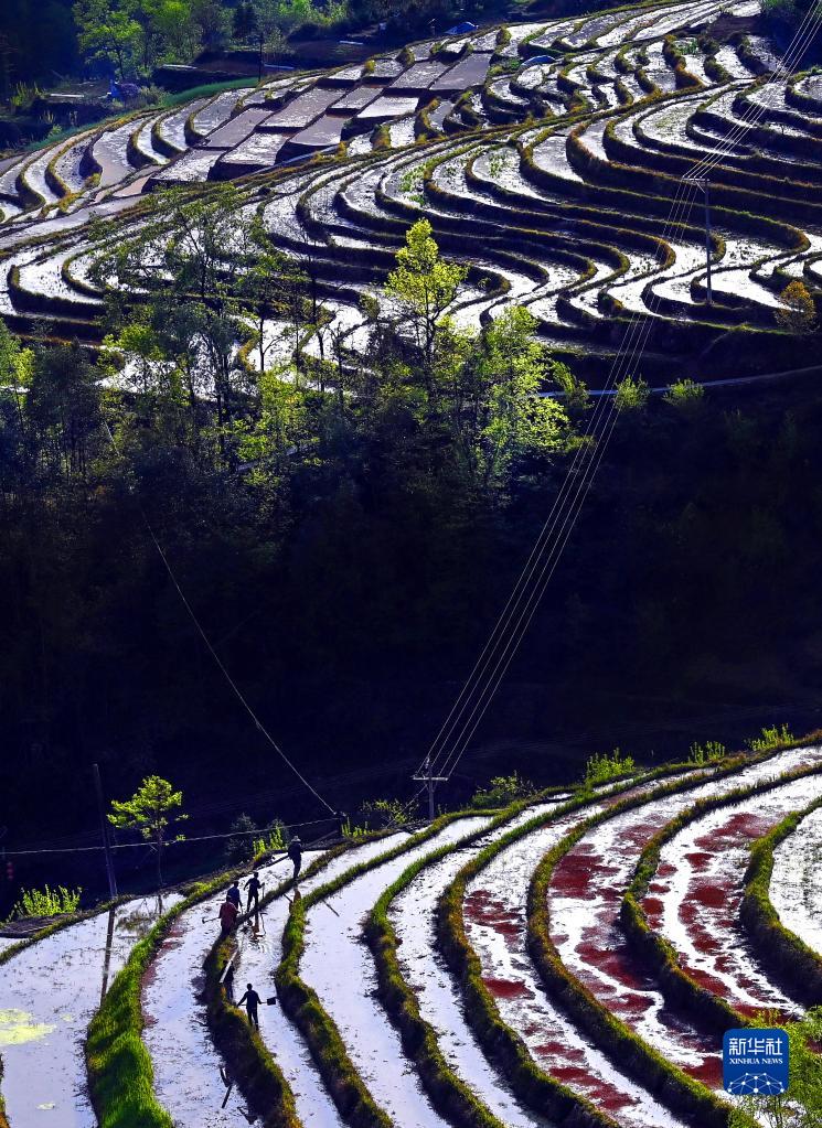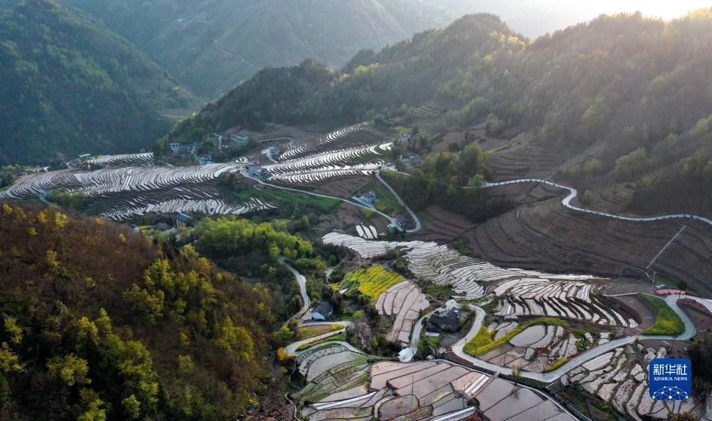 3月28日,南宫山镇桂花村的村民在古梯田里备耕(无人机照片)。近日,在陕西省安康市岚皋县南宫山镇桂花村,因春灌备耕,沿山势自上而下层层铺叠的千亩梯田,仿佛戴上了一串串银链,构成了一幅优美的田园风光图。新华社记者 陶明 摄