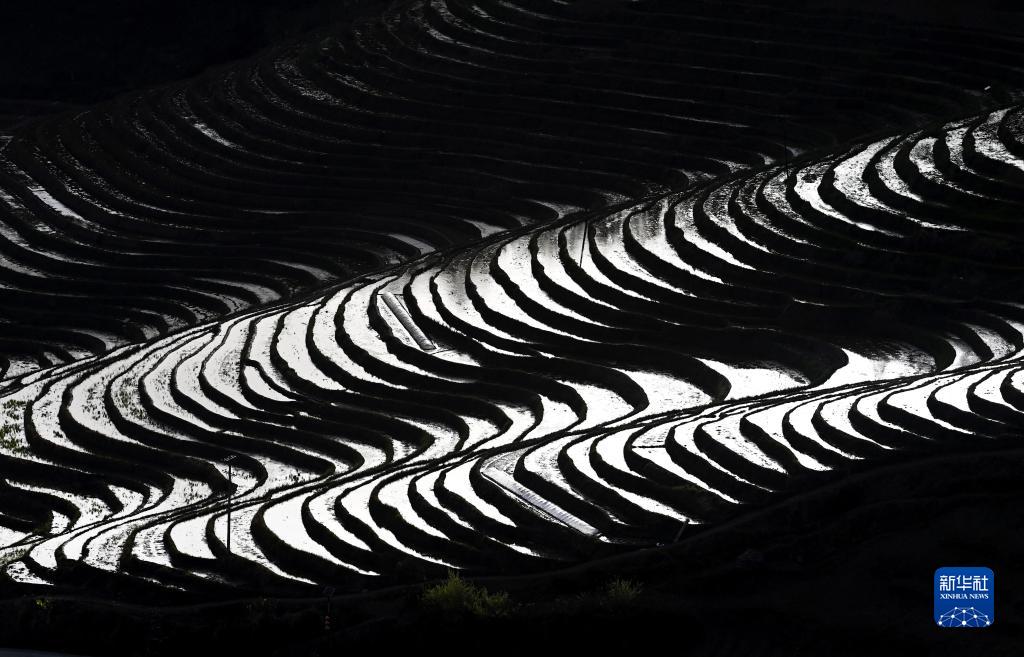 3月28日拍摄的南宫山镇桂花村千亩古梯田(无人机照片)。近日,在陕西省安康市岚皋县南宫山镇桂花村,因春灌备耕,沿山势自上而下层层铺叠的千亩梯田,仿佛戴上了一串串银链,构成了一幅优美的田园风光图。新华社发(邱仕君 摄)