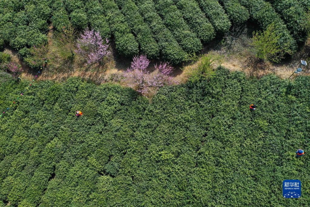 3月29日,采茶人员在黄龙岘茶园采摘鲜叶(无人机照片)。