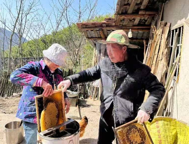 偶遇一对古稀之年老夫妻,忙于摇蜜。夫妻俩是界富村一组金鸡坪人,精神矍铄,身体康健。夫妻俩勤劳热情,为欢度晚年,在家养了五十余箱蜜蜂。夫妻俩平均每年可赚十万余元,乐享其趣而无忧无虑。