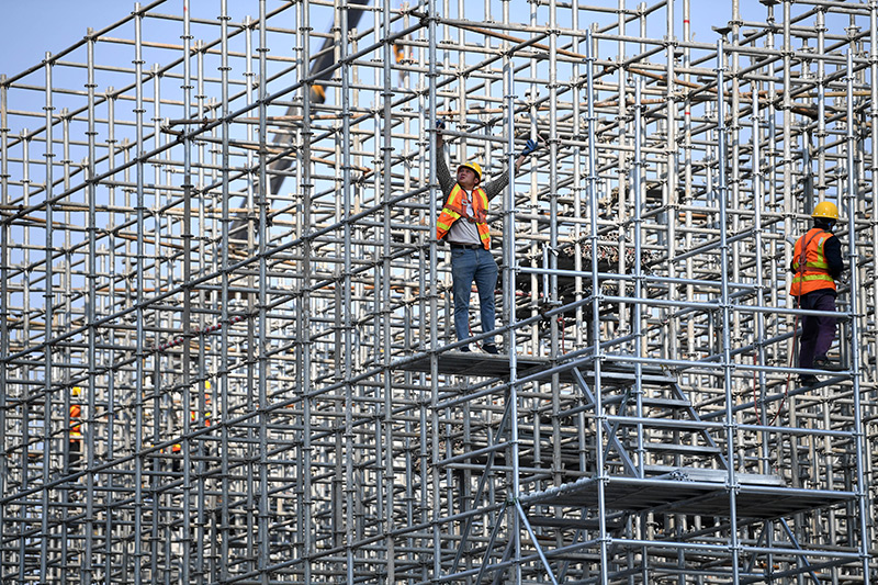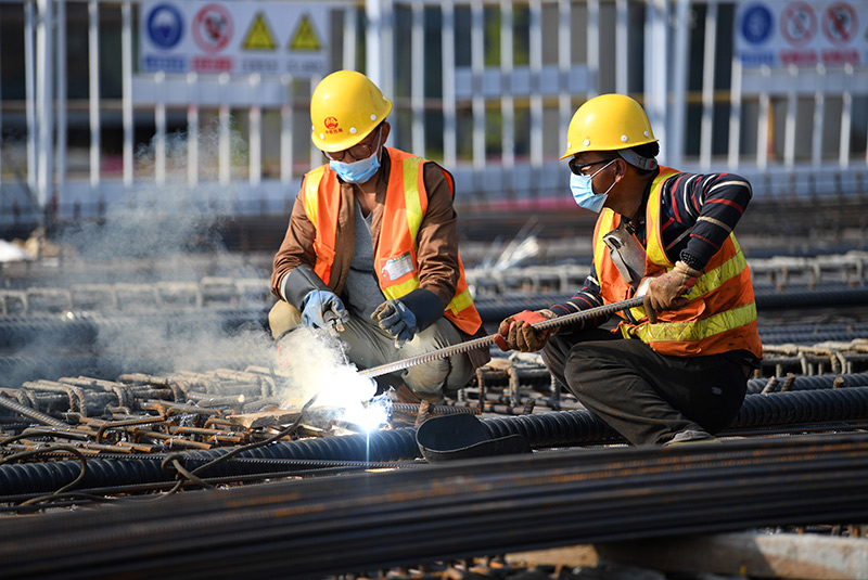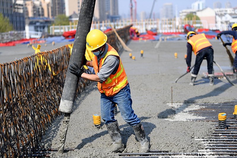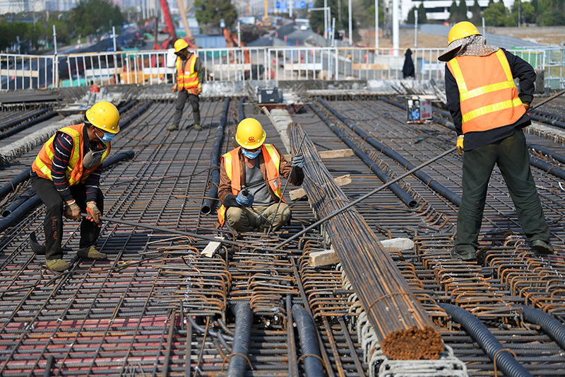 4月3日,中铁四局工人在安徽合肥金寨路快速化改造工程施工现场作业。